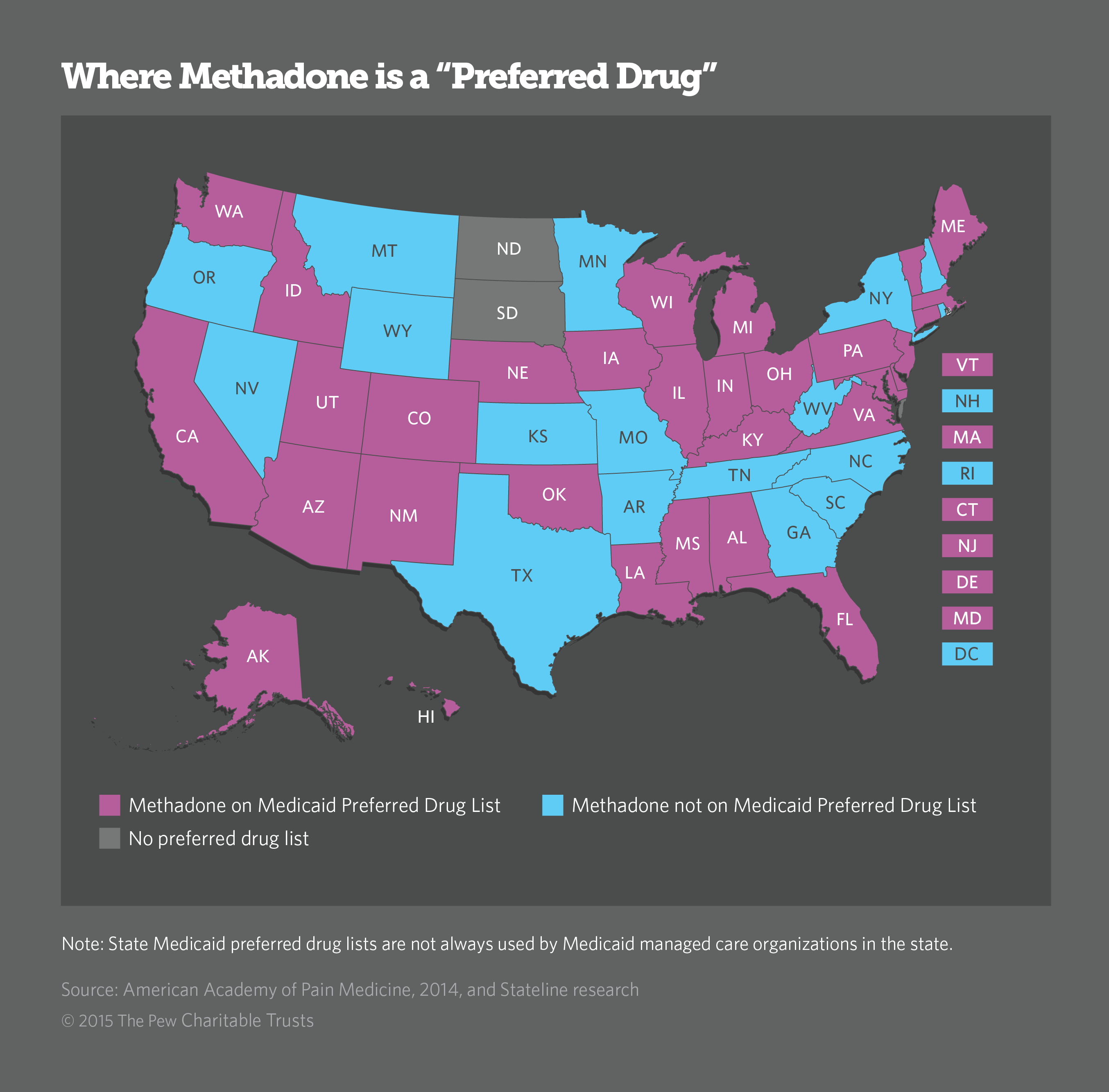 The District of Columbia and at least 16 other states took similar actions. Arkansas, Georgia, Kansas, Minnesota, Missouri, Montana, Nevada, New Hampshire, New York, Oregon, Rhode Island, South Carolina, Tennessee, Texas, West Virginia and Wyoming no longer list methadone as a preferred long-acting analgesic.
