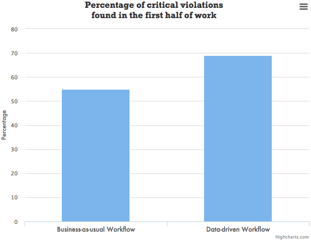 When the health department conducted 1,637 inspections between September and October, 258 had a critical violation and 141, or 55 percent, one found in the first month. Contrast that with the city’s new computer algorithm gauging violation probabilities, which would’ve seen 178 restaurants, or 69 percent, with critical violations inspected in the first month.