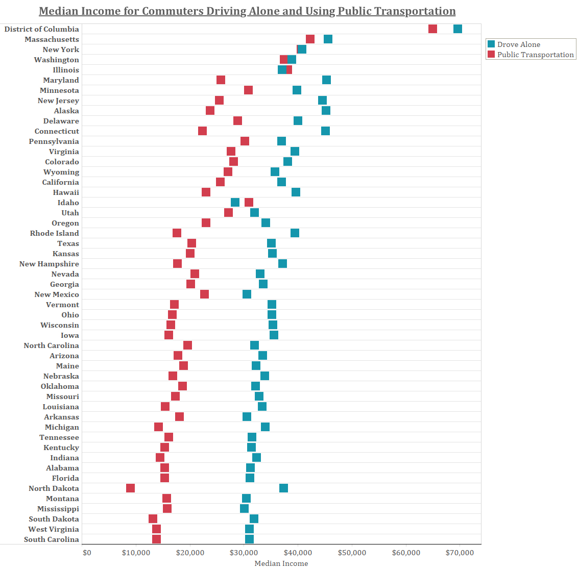 This final chart shows median earnings estimates for last year, for people commuting alone in their cars (blue squares) and those taking public transportation (red squares).