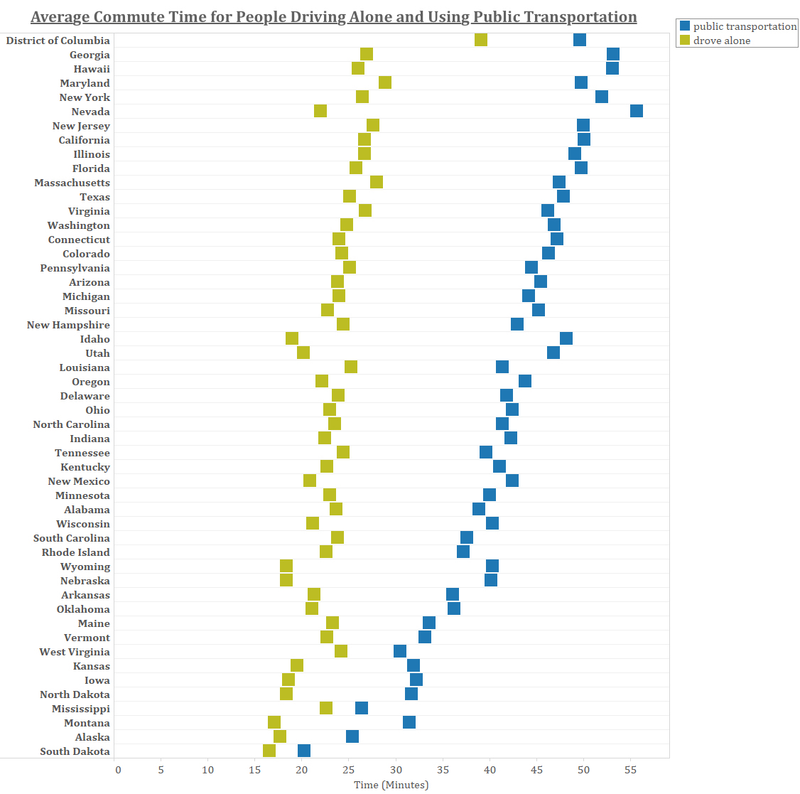 With that caveat about the total number of public transit commuters in mind, here is another chart, which shows average commute times for people driving alone (green squares), versus those using public transit (blue squares), in all 50 states and Washington, D.C.