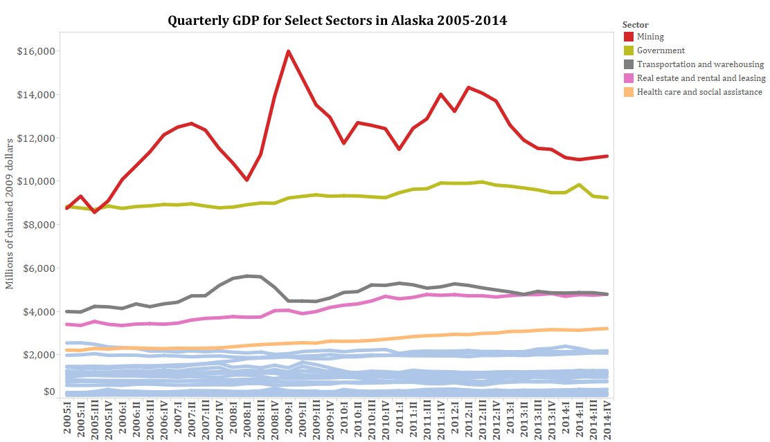 The oil and gas sector, which is captured in the red mining line on the chart, has long been the dominant force in Alaska's economy. But by the end of 2014, GDP figures for the industry had sunk about 22 percent compared to levels in late 2012.