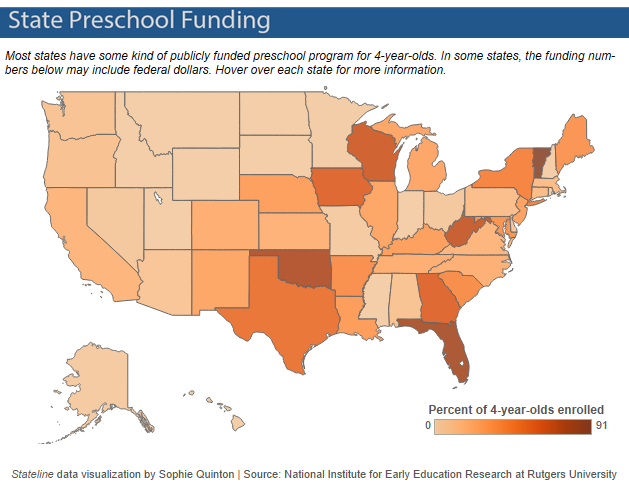 Over 65 percent of 4-year-olds in Florida, Oklahoma, Wisconsin, West Virginia and Vermont participated in a state-supported program last year. NIEER calculates that between state programs and Head Start, a federal program for poor families, 41.5 percent of 4-year-olds nationwide attend publicly funded preschool.