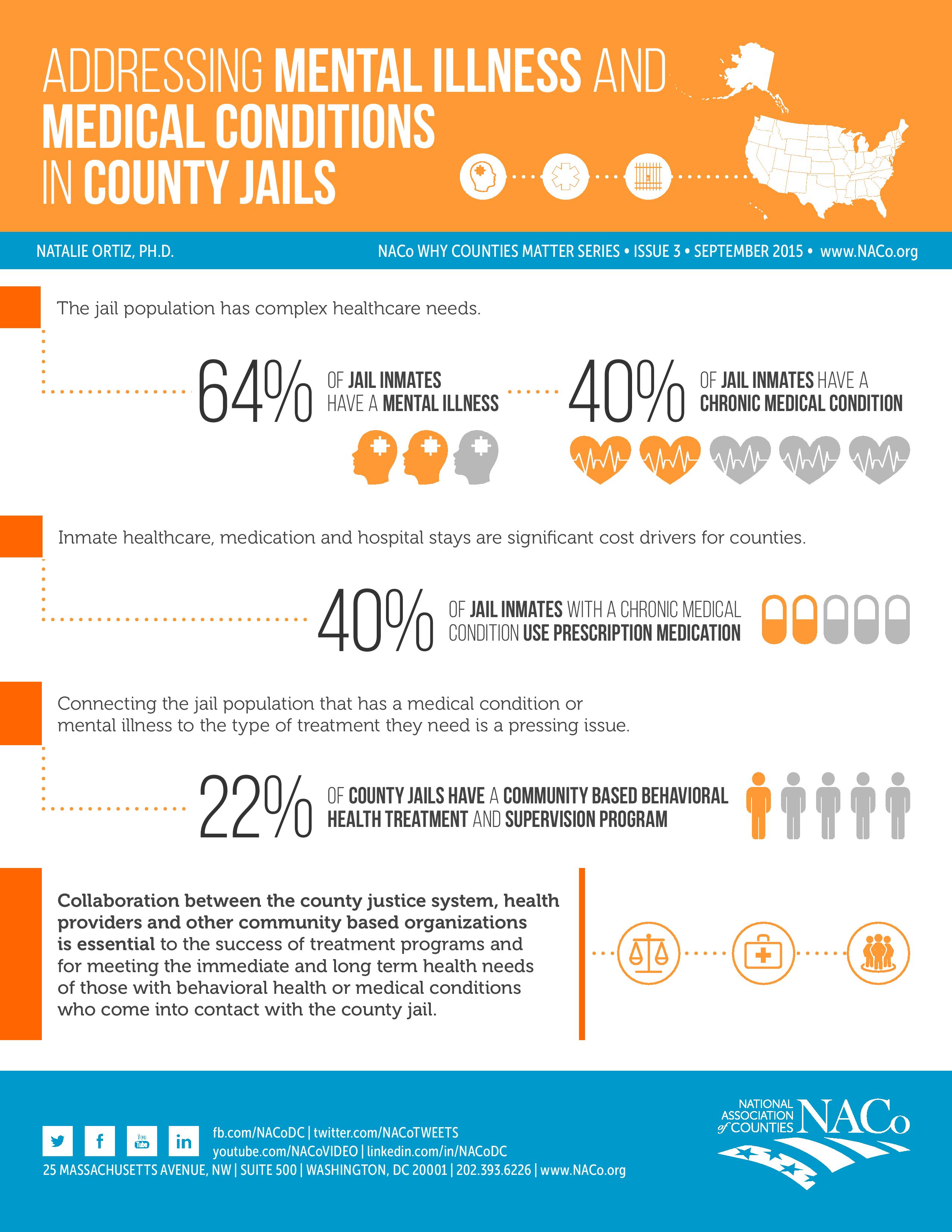 “Individuals in county jails are more likely to have mental illnesses or medical conditions than the general population, and addressing inmates’ health needs is a significant priority for counties,” Dr. Natalie Ortiz, the report’s author, said in a statement. “Meeting the needs of this popula­tion requires county jails to collaborate with health professionals and treatment providers.”