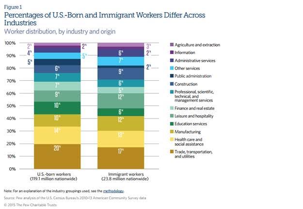 At the national level, immigrant workers are distributed differently across industries than their U.S.-born counterparts. Immigrants are more likely than U.S.-born workers to hold jobs in six of the 13 major industries examined, including manufacturing and administrative services.