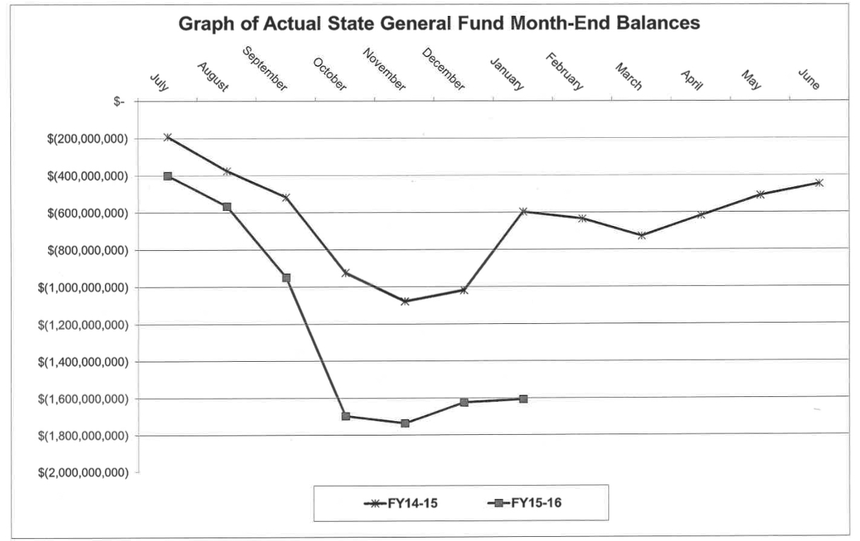 A report from the Louisiana Department of the Treasury shows that between October and January, general fund month-end balances have been negative by amounts ranging from $1.6 billion, to $1.8 billion.