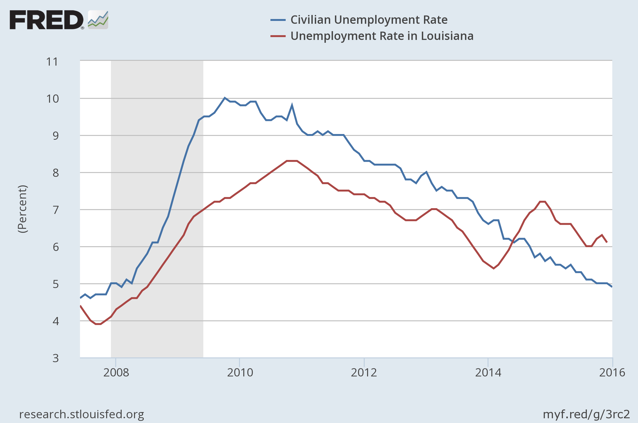 Louisiana’s seasonally adjusted unemployment rate in December was 6.1 percent, according to the U.S. Bureau of Labor Statistics. That’s down from 7.2 percent in December 2014, but higher than the December 2015 national unemployment rate, which was 5 percent.