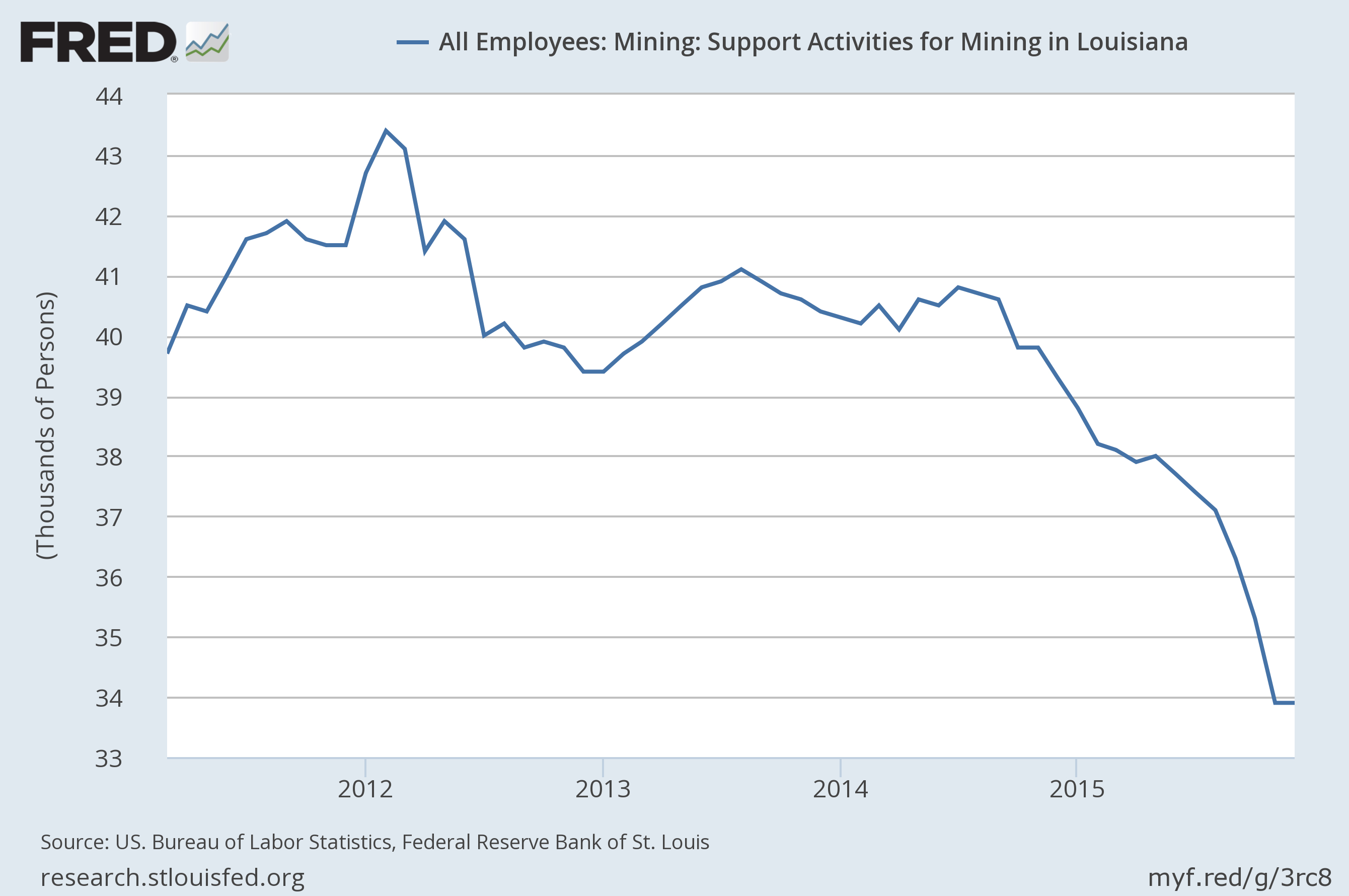 The number of jobs in Louisiana industries that support the mining sector, which includes gas and oil extraction, fell from about 40,800 in July of 2014 to 33,900 in December 2015, according to Bureau of Labor Statistics data.