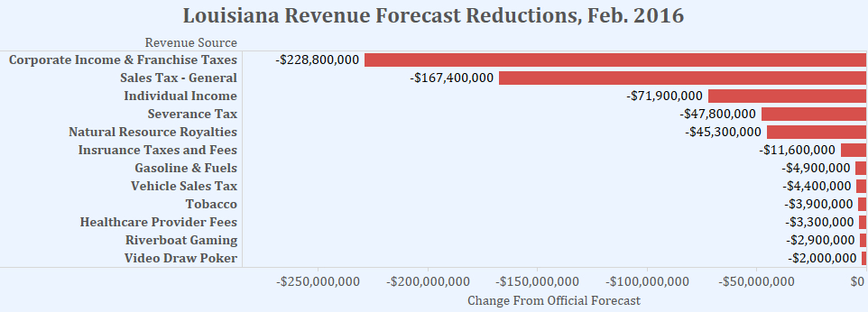Revised estimates lowered the state’s overall amount of projected general fund revenues by about $570 million in the current fiscal year, which ends June 30. In other words, money from taxes and other sources Louisiana planned on having to pay its bills for the year is expected to fall short by over a half-billion dollars.