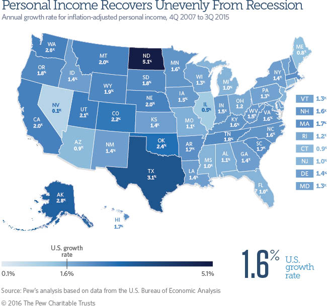 Although growth since the recession has been far-reaching, its pace has been slower than normal. Since the downturn began in the fourth quarter of 2007, estimated U.S. personal income has increased by a constant annual rate of 1.6 percent through the third quarter of 2015, compared with 2.8 percent over the past 30 years, after accounting for inflation.