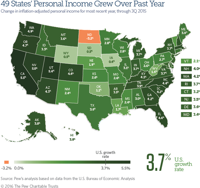 Download the data to see state-by-state growth rates for personal income from 2007 through the third quarter of 2015. Visit The Pew Charitable Trusts’ interactive resource, Fiscal 50: State Trends and Analysis, to sort and analyze data for other indicators of state fiscal health.