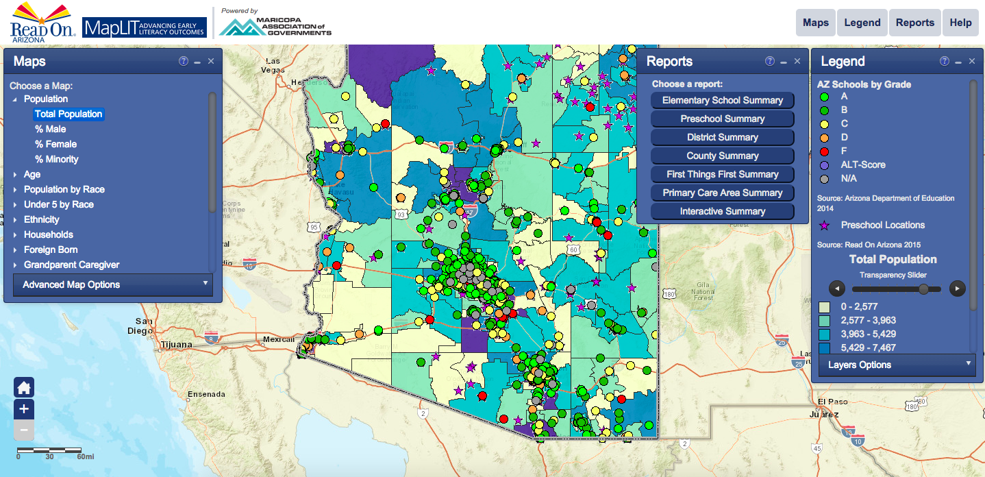 The MAG staff agreed and today, the Read On Arizona’s MapLIT website displays an interactive mapping tool it describes as “a ‘one stop’ resource to identify key data sets (census, school, health, family engagement) that impact early literacy outcomes in communities...providing communities with graphic views of select data for all Arizona public/charter elementary school and preschool site locations.”