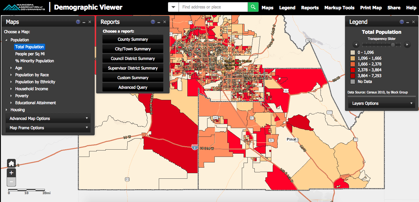 MAG now has a first-class array of maps that display demographic data in the state and in the county down to the block level, employment data, land-use information, bicycle paths and the education data from Read On Arizona.