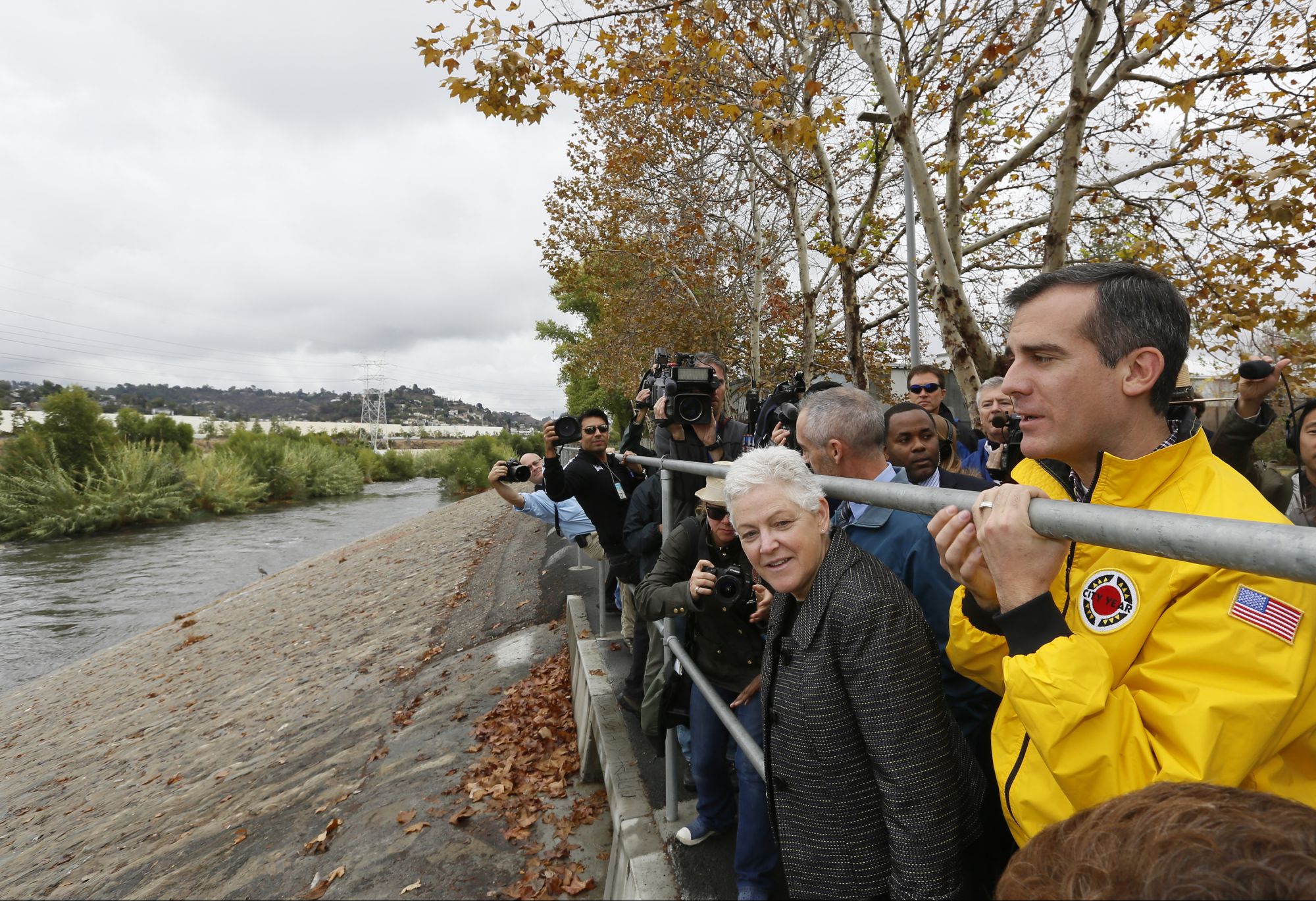 n this Nov. 21, 2013 file photo, Los Angeles Mayor Eric Garcetti, right, with EPA Administrator Gina McCarthy, middle, and City Councilman Mitch O'Farrell tour the Los Angeles River in Los Angeles. (Damian Dovarganes / AP File Photo)