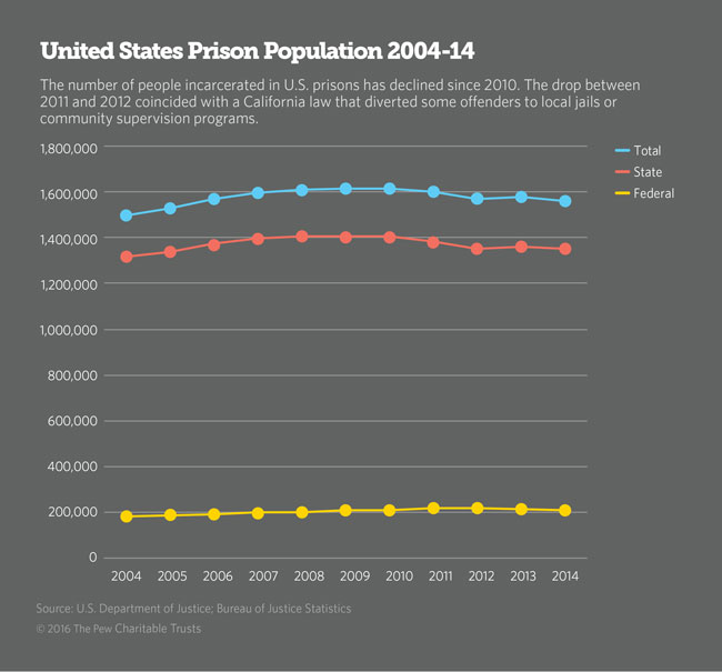 States are already seeing results from this shift in thinking. The number of state and federal prisoners dropped by 28,600 between 2011 and 2012 after the U.S. Supreme Court ruled that overcrowding violated prisoners’ rights to physical and mental health care, and California began diverting nonviolent offenders to serve their sentences in local jails and under community supervision. Between 2013 and 2014, the population in state prisons alone declined by more than 10,000 people, to 1.35 million.