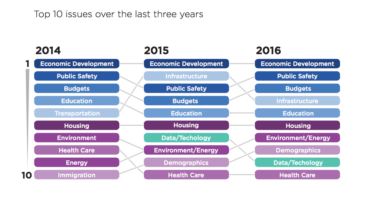 This graphic shows the top ten issues identified in the State of the Cities report over the last three years. (Credit: National League of Cities)