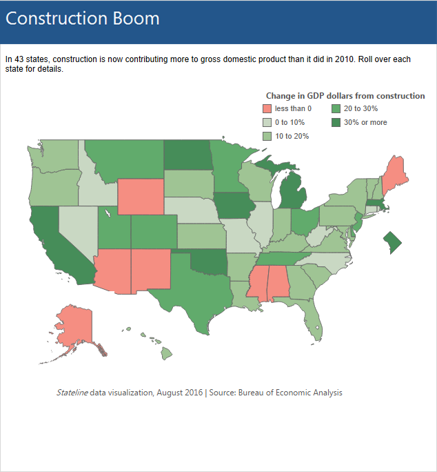 Overall, the construction industry’s impact on U.S. gross domestic product has grown by more than 21 percent since its low point in 2011, according to a Stateline analysis of inflation-adjusted data from the U.S. Bureau of Economic Analysis.