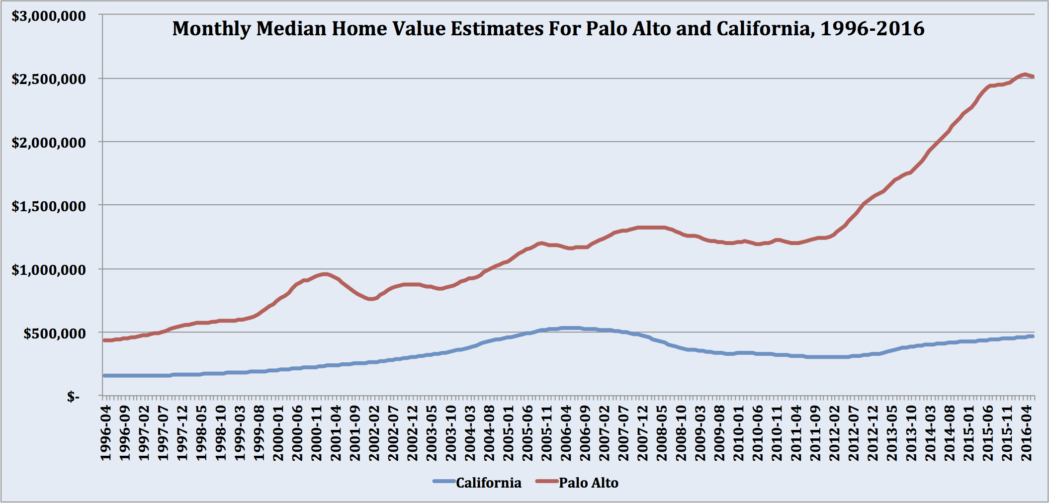 The median home value for all homes in Palo Alto during June of this year was about $2.5 million, according to figures maintained by the real estate data firm Zillow. Statewide in California, the company’s data show that the median value was about $466,000.