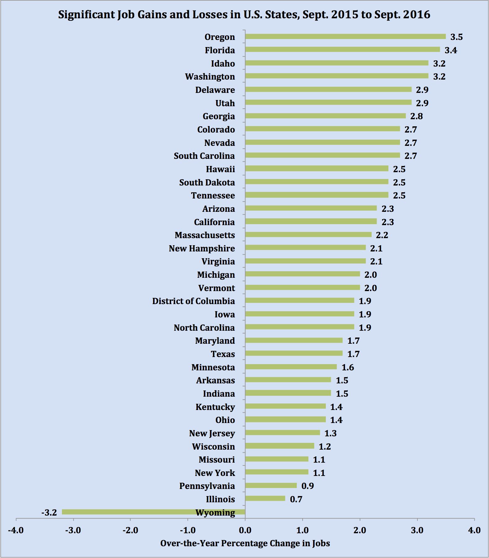 The next two charts show the 36 states, which, along with the District of Columbia, saw significant changes in non-farm payroll employment between last September and this September. Wyoming was the only state that experienced a significant decline in jobs.