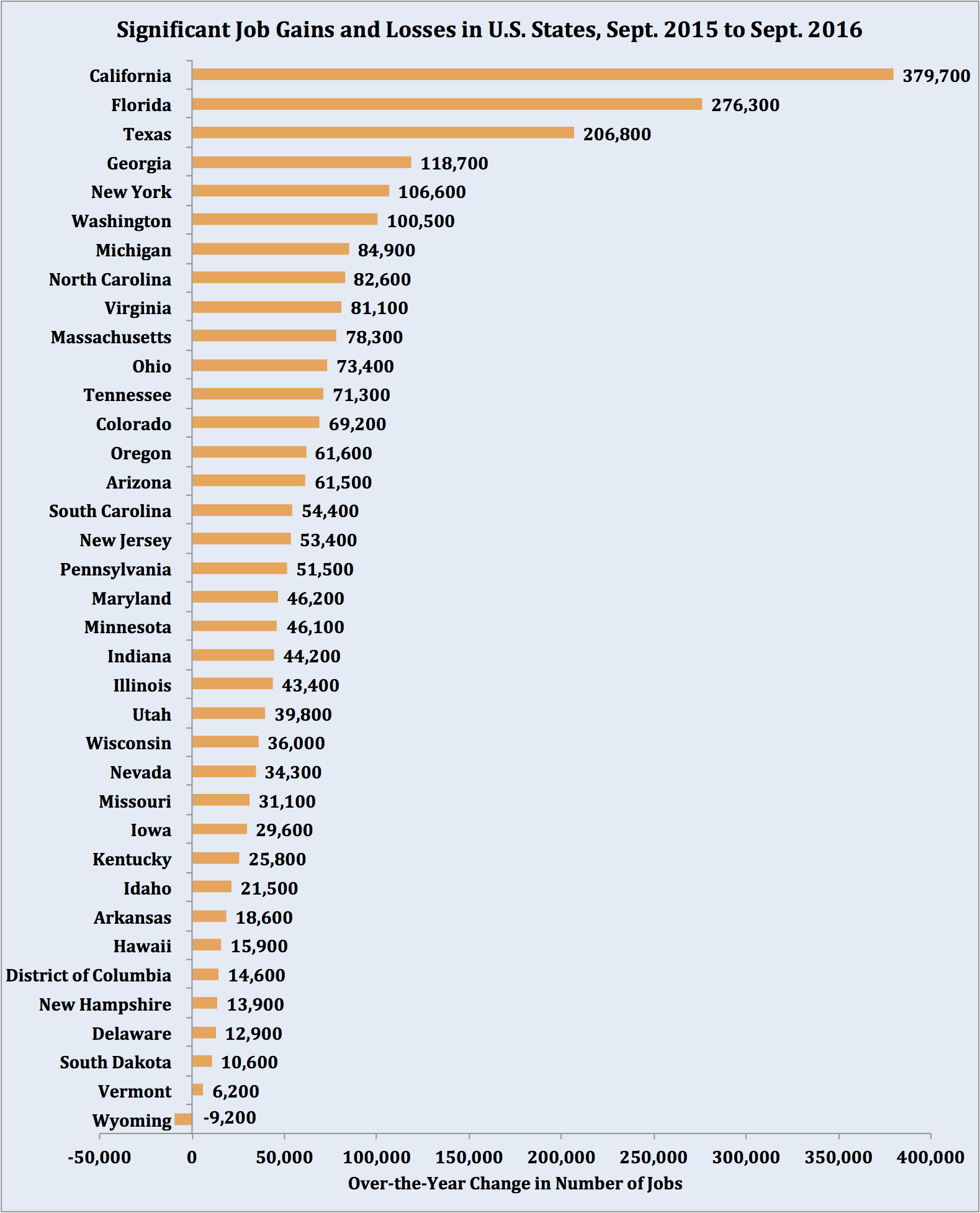 This chart shows the number of jobs gained or lost in each state between September 2015 and September 2016. Changes are based on seasonably adjusted figures for non-farm payroll employment. September 2016 estimates are preliminary. (Data: U.S. Bureau of Labor Statistics / Chart: RouteFifty.com)