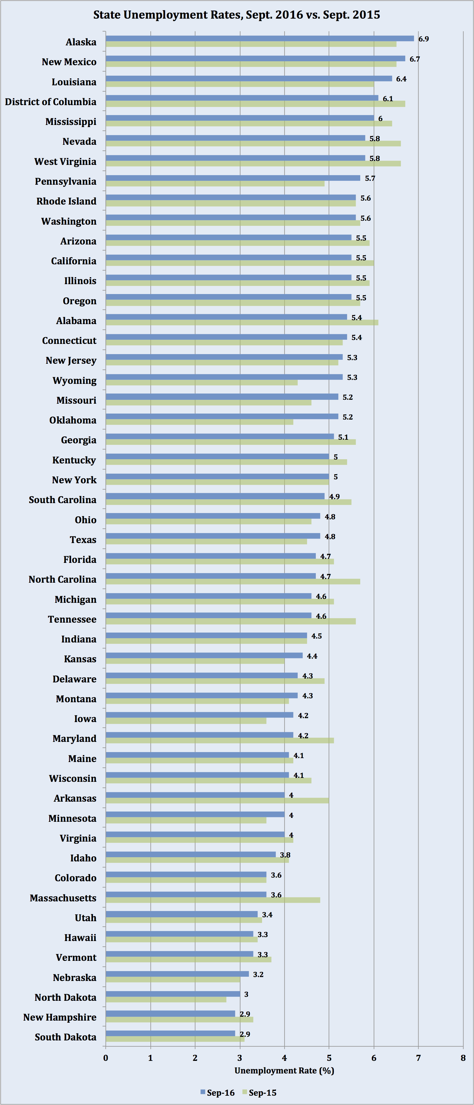 The chart below displays unemployment rates for all 50 states and the District of Columbia. The blue bars and numeric labels show September 2016 rates. For comparison, the green bars show September 2015 rates.