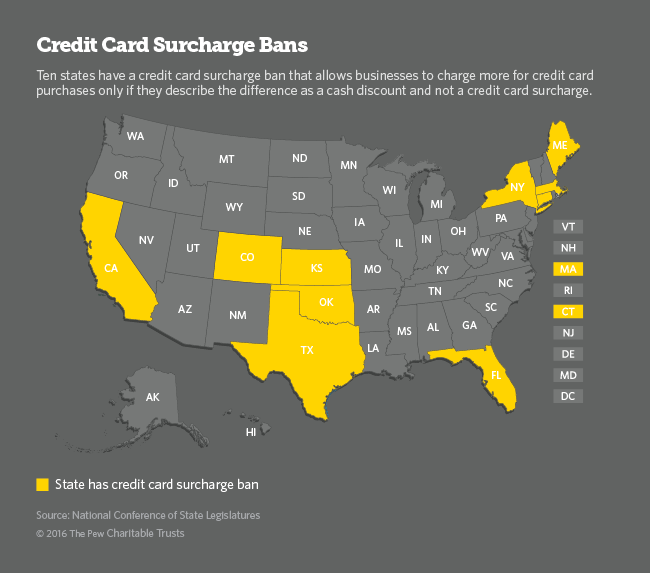 But for many businesses, it was not state law but contracts with credit card companies that prohibited the surcharges. Those restrictions were scaled back after a 2013 class-action suit brought by retailers. But in the 10 states with surcharge bans, businesses cannot charge credit card customers more to cover the cost of swipe fees.