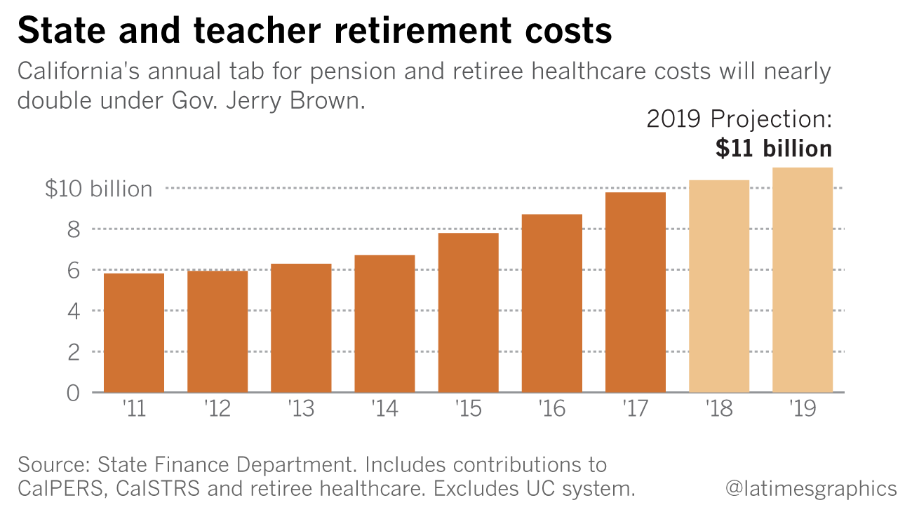 The state’s annual bill for retirement obligations is expected to reach $11 billion by the time Brown leaves office in January 2019 — nearly double what it was eight years earlier.