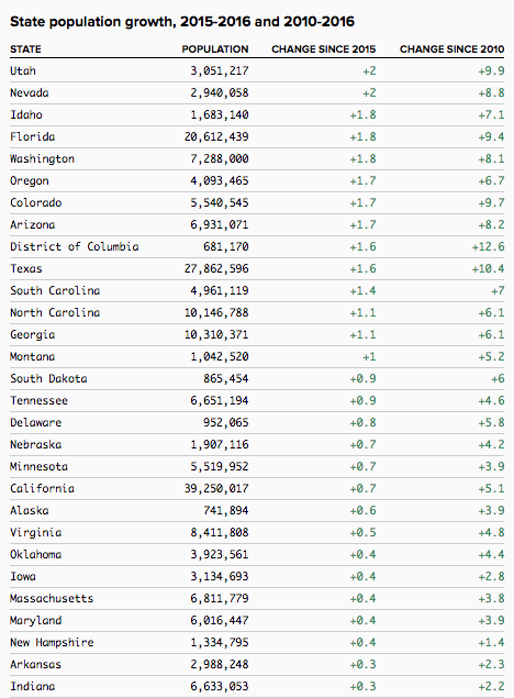 But it’s not the only factor, he said. In 2016, only 57 percent of Utah’s population bump came from so-called natural growth. The rest came from people moving into the state, both from elsewhere in the U.S. and from abroad. Utah’s economy is actually pretty good, and its state government has aggressively courted corporations, leading to sizable investments from eBay and Adobe, Cannon said. As for immigration, many of the state’s new residents come from from Mexico and Central America, and though they’re not Mormons themselves, they typically have children at similarly high rates.