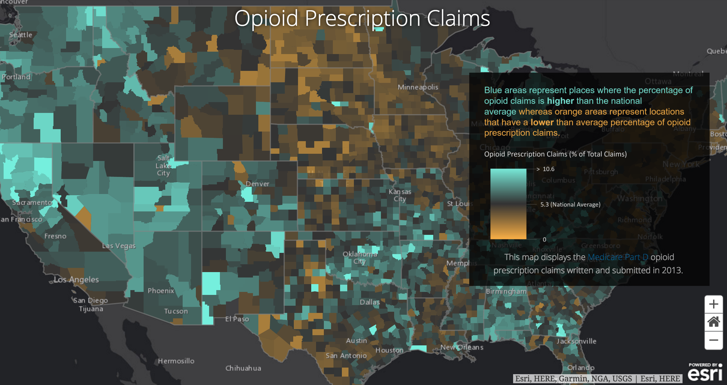 Using the Esri-created Story Maps template, he wove together data on opioid prescription claims, drug poisoning fatalities, painkiller-prescribing providers, combined with congressional voting records to create a powerful narrative  about how the opioid epidemic has taken shape across the country.