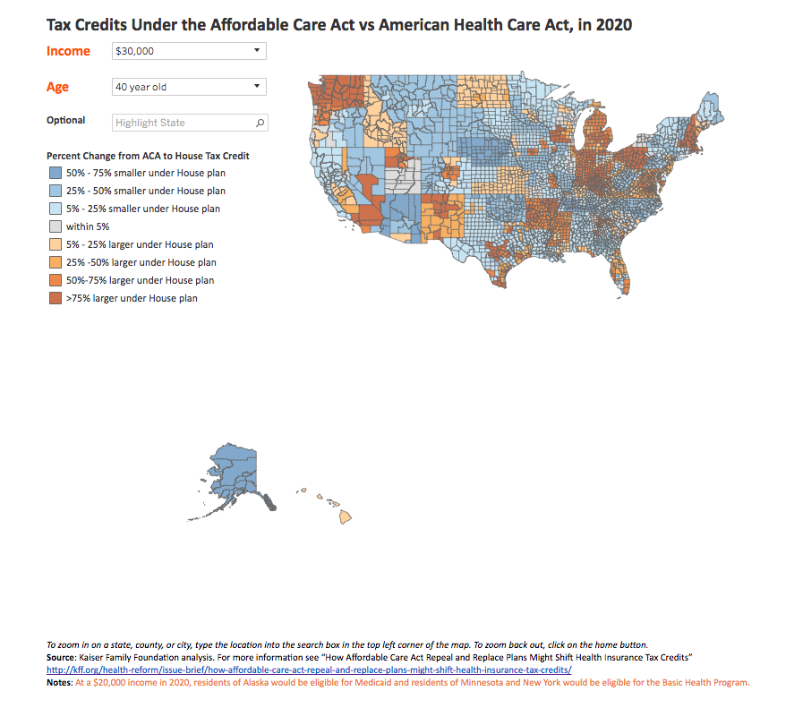 KFF has created a county-level interactive map tool that estimates the credits consumers could expect to receive under the ACA in 2020, compared to what they would receive under the GOP proposal.