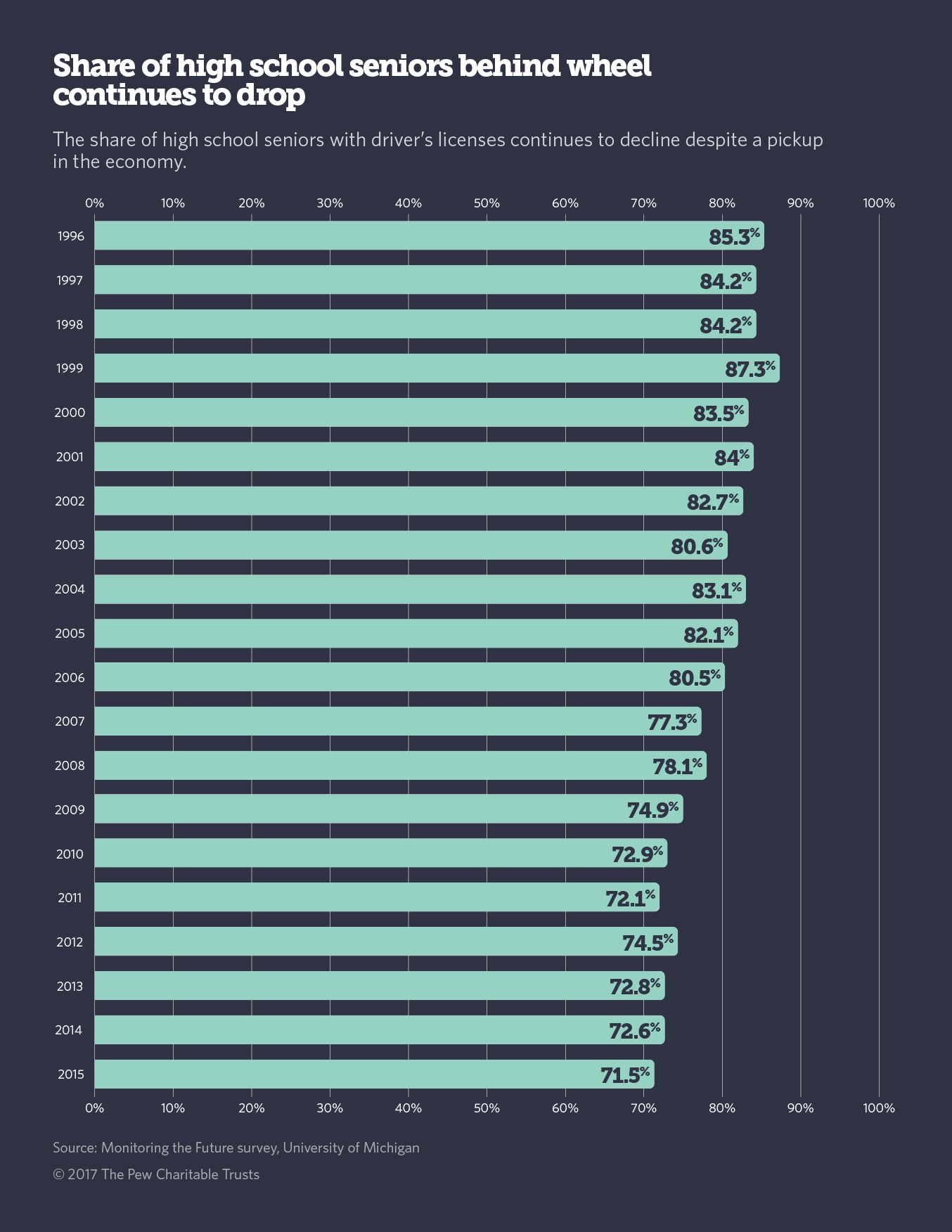 Other teens see things the same way. The share of high school seniors across the country who have a driver’s license dropped from 85.3 percent in 1996 to a record low 71.5 percent in 2015, according to data from the University of Michigan’s Monitoring the Future survey.