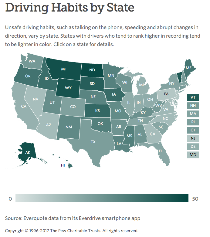 Everquote, an online insurance marketplace, drew its conclusions on regional driving habits from information gathered during 2.7 million car trips over 230 million miles by users of its Everdrive app, for customers who want to gauge and improve their safety habits. The app uses smartphone components to detect speeding, as well as signs of distraction such as phone use and sudden stops, turns and acceleration, said CEO Seth Birnbaum.