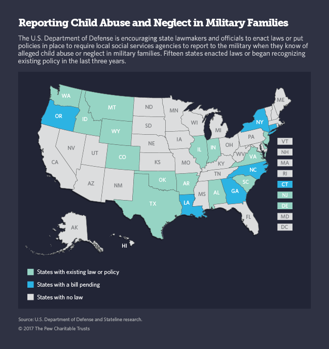 For the past three years, Pentagon officials have been asking states to enact laws or set policies that require local child protective agencies to ask families they work with if they are in the military, and, if they are, to immediately report any suspected abuse or neglect to the military. Fifteen states have enacted such laws or started to follow such policies that were already in place. Nine more states are considering similar bills this year.