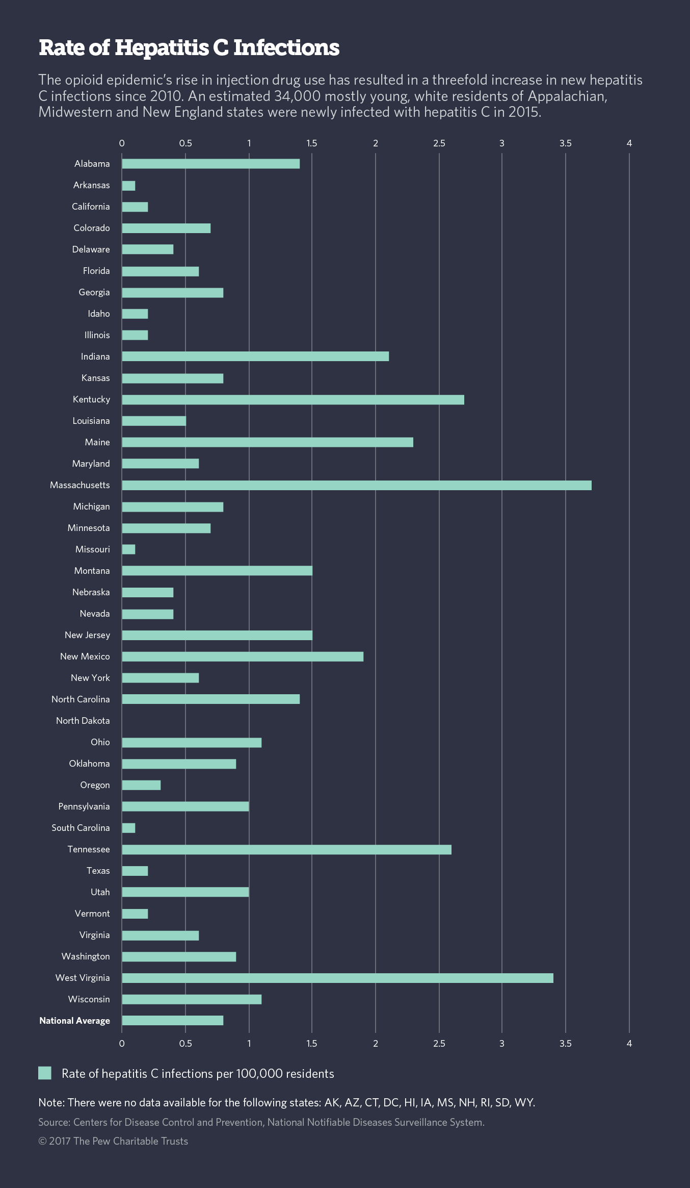 According to CDC data, Indiana, Kentucky, Maine, Massachusetts, New Mexico, Tennessee and West Virginia have hepatitis C infection rates that are at least double the national average. And Alabama, Montana, New Jersey, North Carolina, Ohio, Oklahoma, Pennsylvania, Utah, Washington and Wisconsin have rates that are higher than the national average.