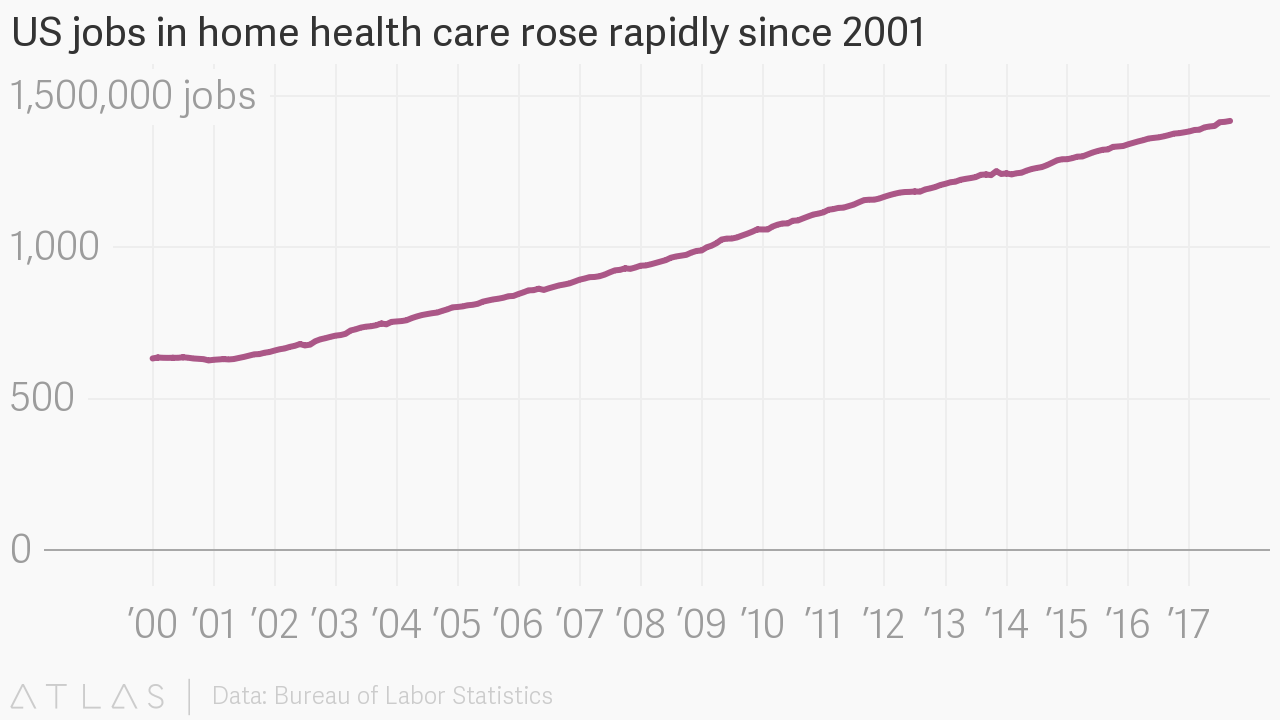 The projections for the growth of elderly-care aides are consistent with recent history. The number of U.S. workers in home health care jumped from less than 700,000 in 2002 to more than 1.4 million in 2017. (Historical data on personal care workers is unavailable.)