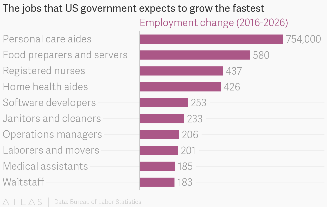 The U.S. Bureau of Labor Statistics recently released their projections of which jobs will grow the fastest from 2016 to 2026. The Bureau expects the job of “personal-care aide” to grow faster than any other, with about 750,000 additional jobs; “home-health aide” is fourth on their list of fastest growers, adding an additional 425,000 jobs to the economy. Both jobs involve assisting people with diseases and disability, usually the elderly, as they continue to live their lives at home—the major difference being that home-health aides can legally offer some medical services.