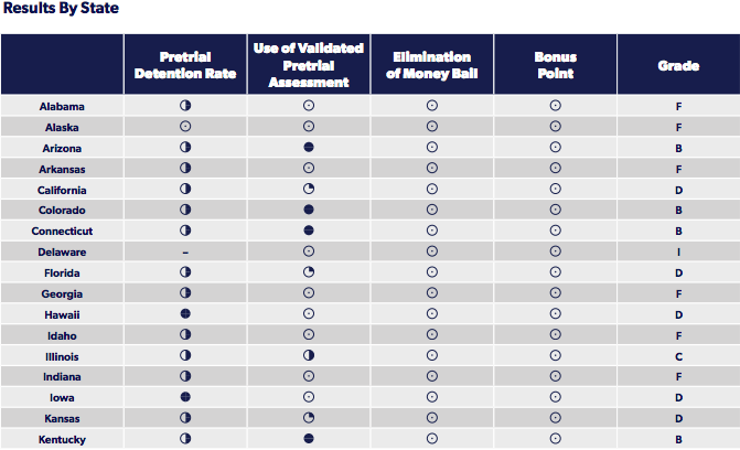 States were scored on three bellwethers: their pretrial detention rates, use of validated pretrial assessments and elimination of money bail.