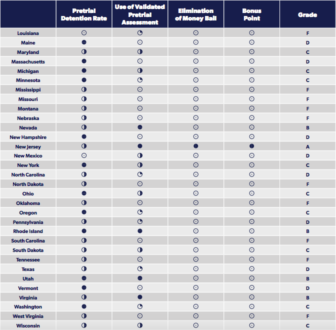 Pretrial justice refers to the period between a person’s arrest and trial, other state systems earning eight Bs, 10 Cs, 13 Ds, and 17 Fs—with Delaware getting an incomplete for unavailable pretrial detention rate data—for a D national average.