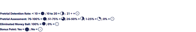 A state with a pretrial detention rate 21 percent or higher received no points, while a state with a rate less than 10 percent received a high of 2 points. Those without any jurisdictions using validated pretrial assessments received no points, while those with 76 to 100 percent of the system using them received a maximum 4 points. An additional point was awarded if money bail was deemed functionally eliminated, as was a bonus point if both that and 100 percent usage of validated pretrial assessments was true for the state.