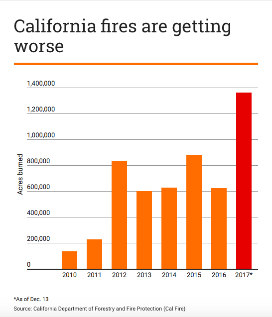 In less than one week, for example, October’s wine-country fires discharged harmful emissions equal to that of every car, truck and big rig on the state’s roads in a year. The calculations from the subsequent fires in Southern California are not yet available, but given the duration and scope of the multiple blazes, the more recent complex of fires could well exceed that level.