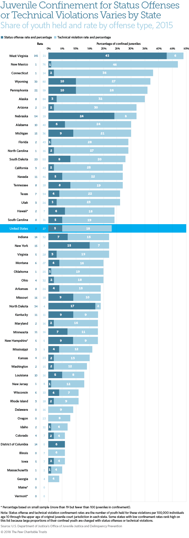 West Virginia leads the nation in removing youth from their homes for status offenses, with 43 percent of juveniles in its facilities held for such infractions. Eight other states also confine youth for status offenses at more than double the national rate of seven per 100,000 youth. Six states report holding no youth for status offenses.