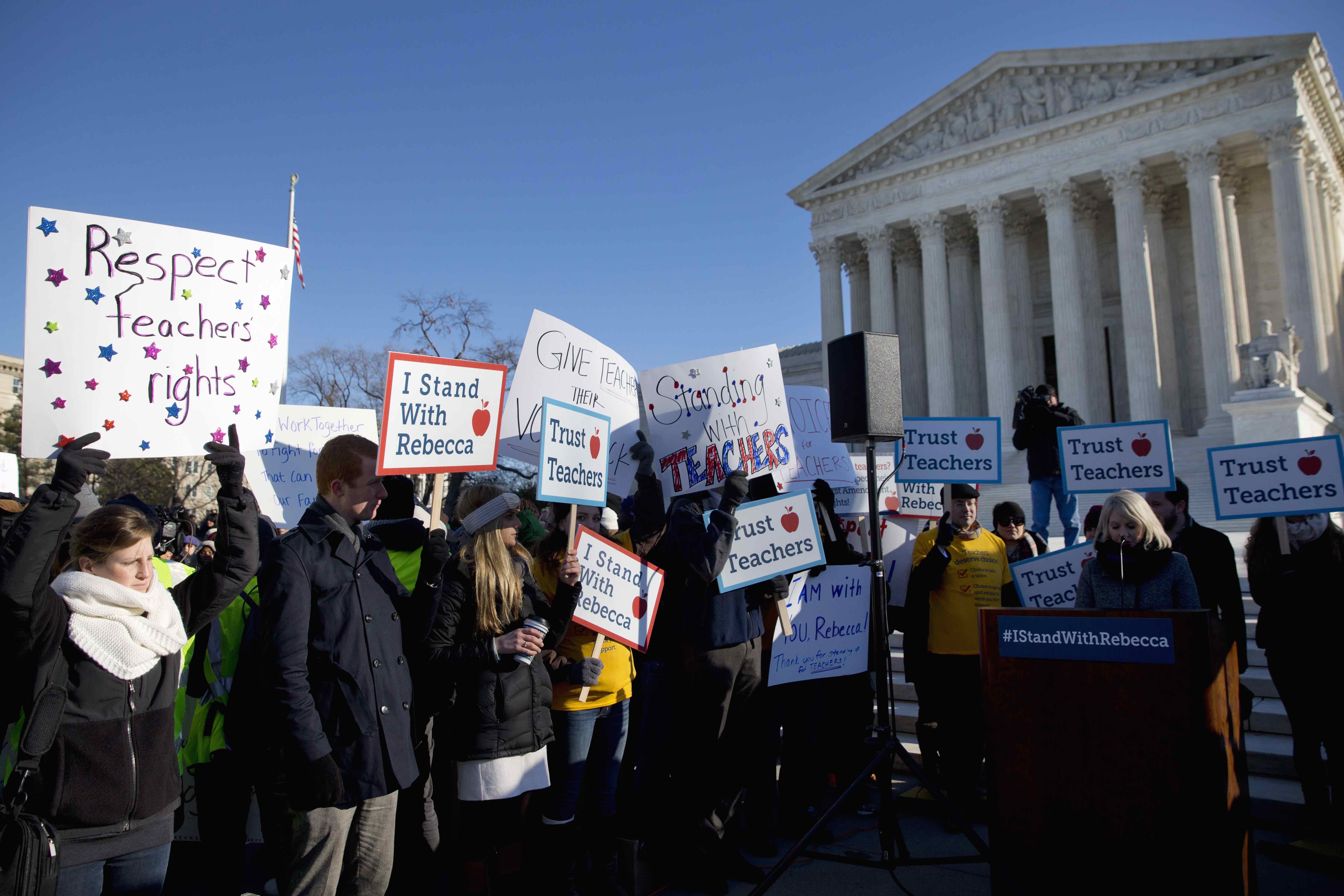 People participate in a rally at the Supreme Court in Washington, Monday, Jan. 11, 2016, as the court heard arguments in the 'Friedrichs v. California Teachers Association' case. (AP Photo/Jacquelyn Martin)