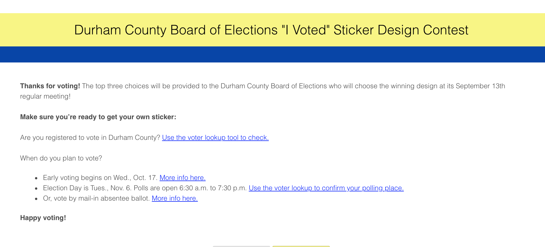 Three months ahead of the general election, officials in Durham County, North Carolina are offering voters the chance to cast a ballot in a different type of contest—a competition to select a new design for the coveted “I Voted” sticker distributed at the polls.