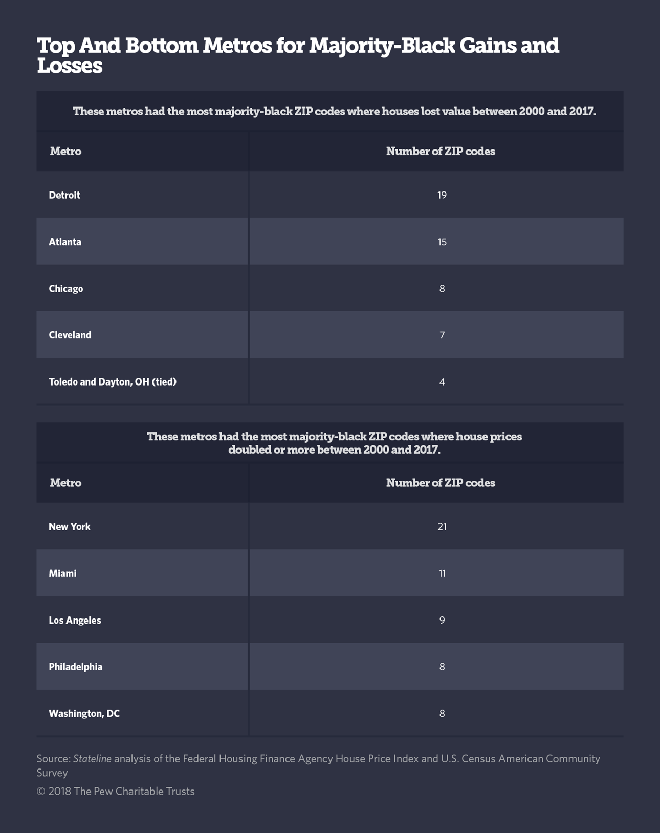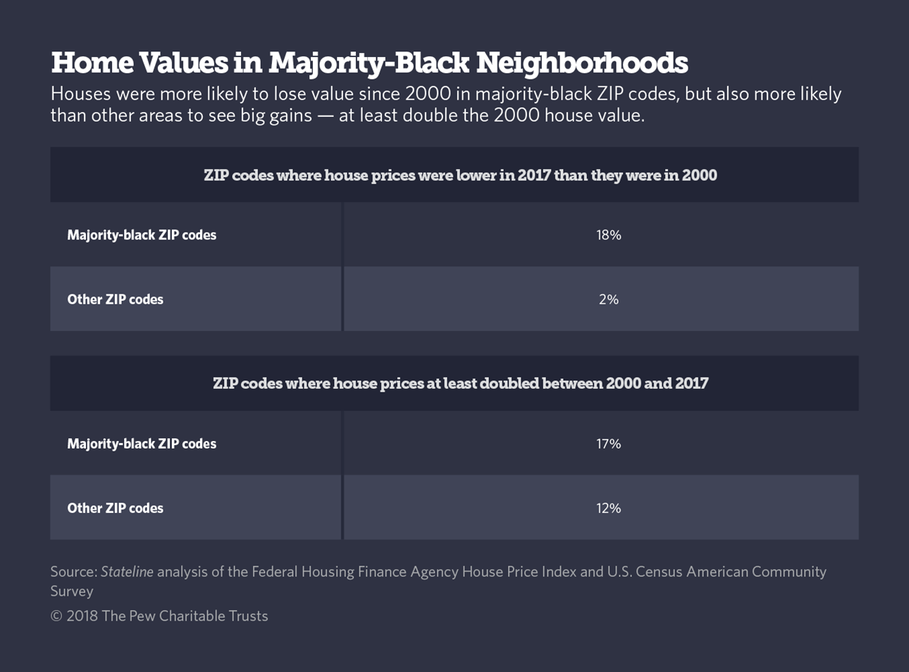 In nearly a fifth of the ZIP codes where most homeowners are black, home values have decreased since 2000, compared with only 2 percent of ZIP codes where black homeowners are not the majority, according to a Stateline analysis of federal data on home prices, race and income.