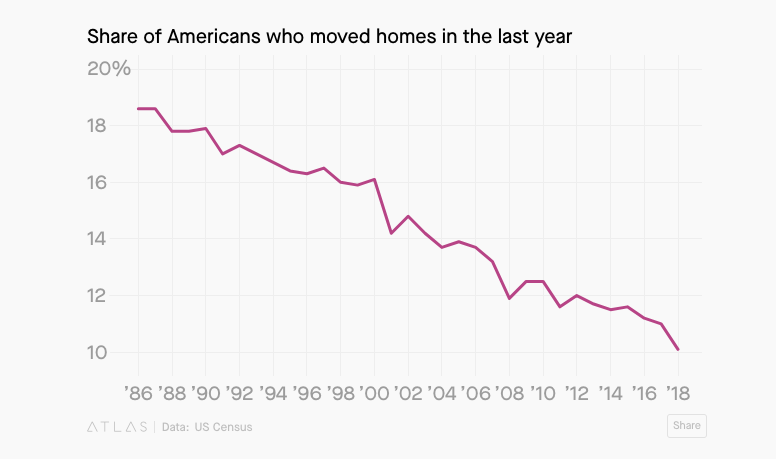 The census tracks moves within counties, within states, or across states, and no matter how you look at it, moving rates are way down from just 15 years ago. For example, from 2002 to 2003, 2.8% of Americans moved across state lines. From 2017 to 2018, it was just 1.5%.