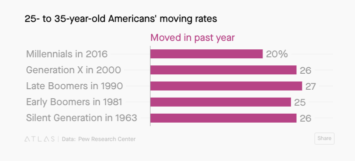 It’s not just a result of an aging population. One of the major reasons for the decline is the relative immobility of millennials. The current crop of 25-35 year olds moves at a lower rate than previous generations at the same age over the past 50 years. (See here for a helpful definition of each generation.)