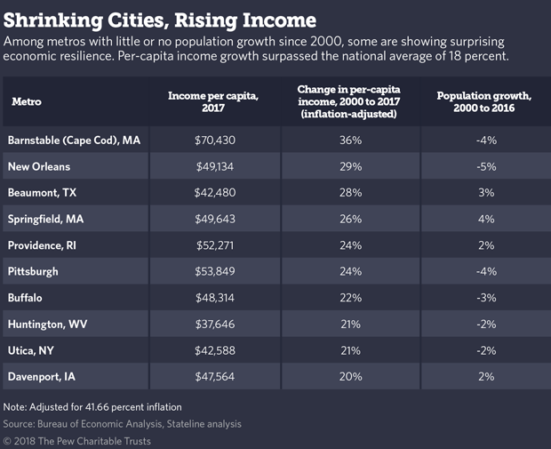 Some of these metro areas have high-paying jobs in energy, health care or education. Others have managed to reshape their manufacturing legacies for a new economy. All of them are evidence that despite conventional wisdom, cities don’t necessarily need population growth and more jobs to be economically healthy.