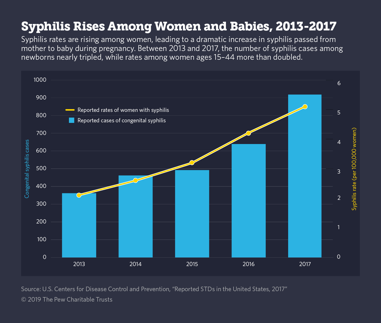 The number of congenital syphilis cases climbed by 154 percent between 2013 and 2017. More than 900 cases were reported in 37 states in 2017—the highest number of cases in the past two decades.