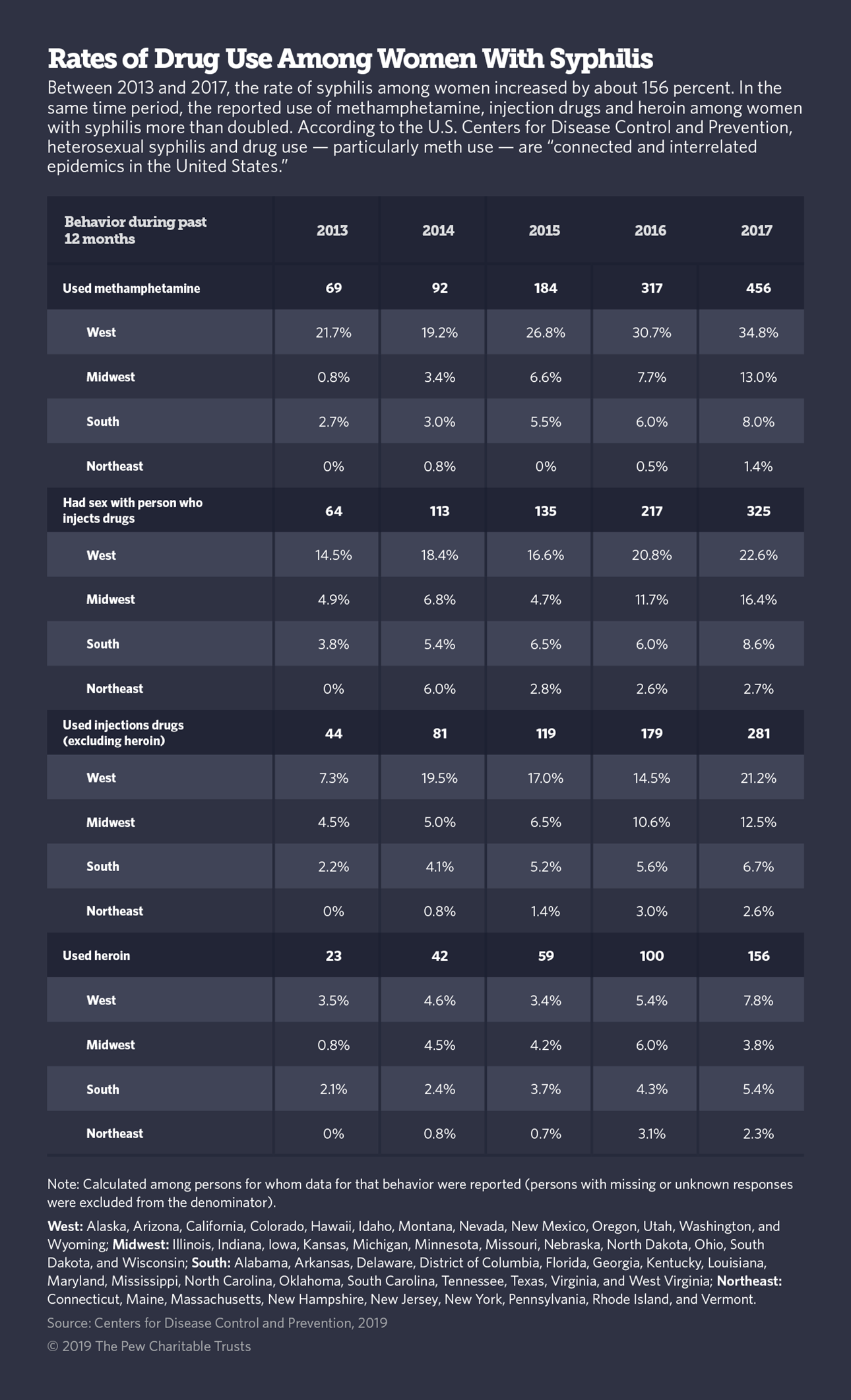 The use of meth, heroin and other injection drugs among women with syphilis more than doubled between 2013 and 2017, according to a CDC report released this month. The report doesn’t include data on opioids other than heroin, but CDC spokesman Brian Katzowitz said the agency plans to add that information to future reports.