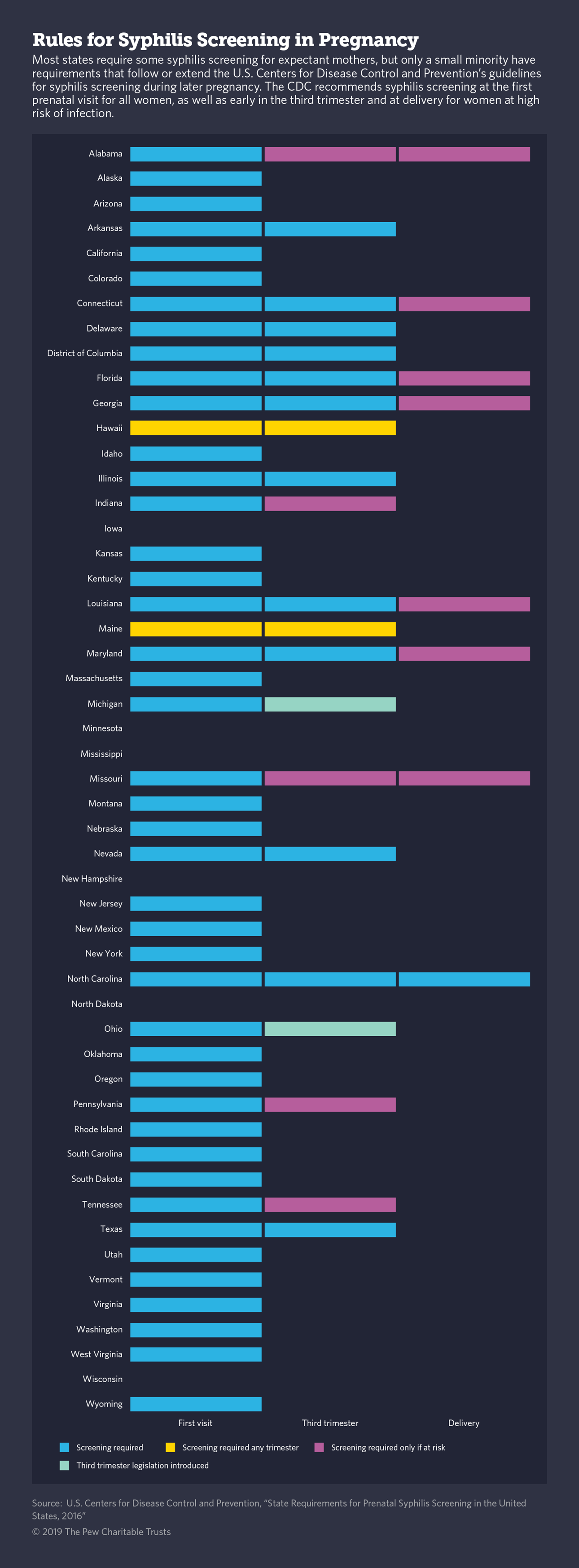 All but six states—Iowa, Minnesota, Mississippi, New Hampshire, North Dakota and Wisconsin—require prenatal syphilis screenings.