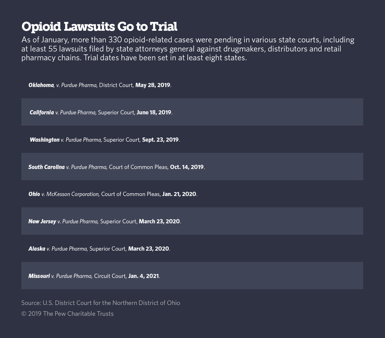In the latest round of litigation, nearly all states have filed lawsuits against drugmakers, distributors and retailers. Most of the cases do not have set court dates.